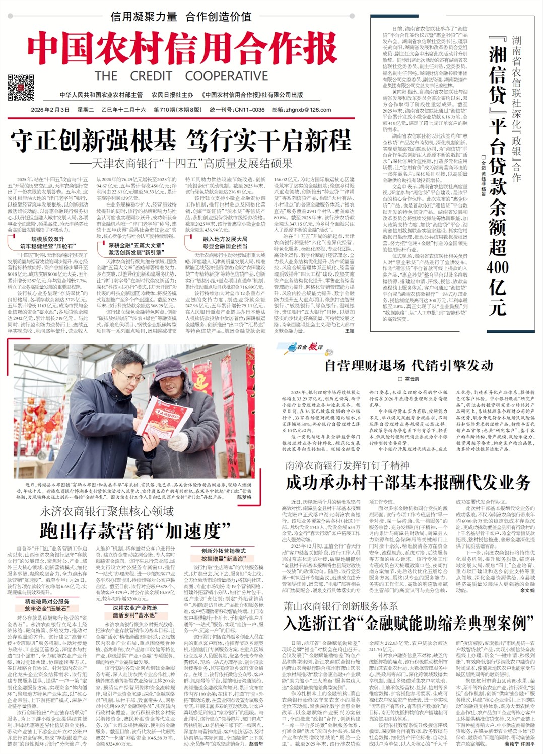 中国农村信用合作报要闻 湖南省农信联社深化“政银”合作 “湘信贷”平台贷款余额超400亿元 自营理财退场 代销引擎发动 南漳农商银行发挥钉钉子精神 成功承办村干部基本报酬代发业务 守正创新强根基 笃行实干启新程 ——天津农商银行“十四五”高质量发展结硕果 图片新闻 萧山农商银行创新服务体系 入选浙江省“金融赋能助缩差典型案例” 永济农商银行聚焦核心领域 跑出存款营销“加速度”